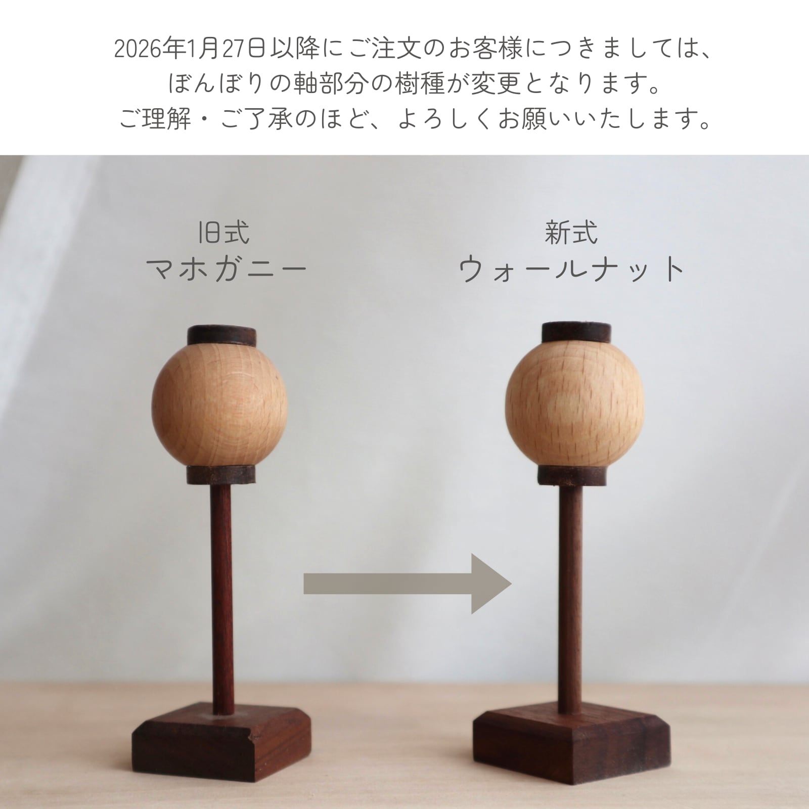※2026年1月27日以降にご購入のお客様につきましては、ぼんぼりの棒部分の樹種を、従来のマホガニーからウォールナットへ変更させていただきます。