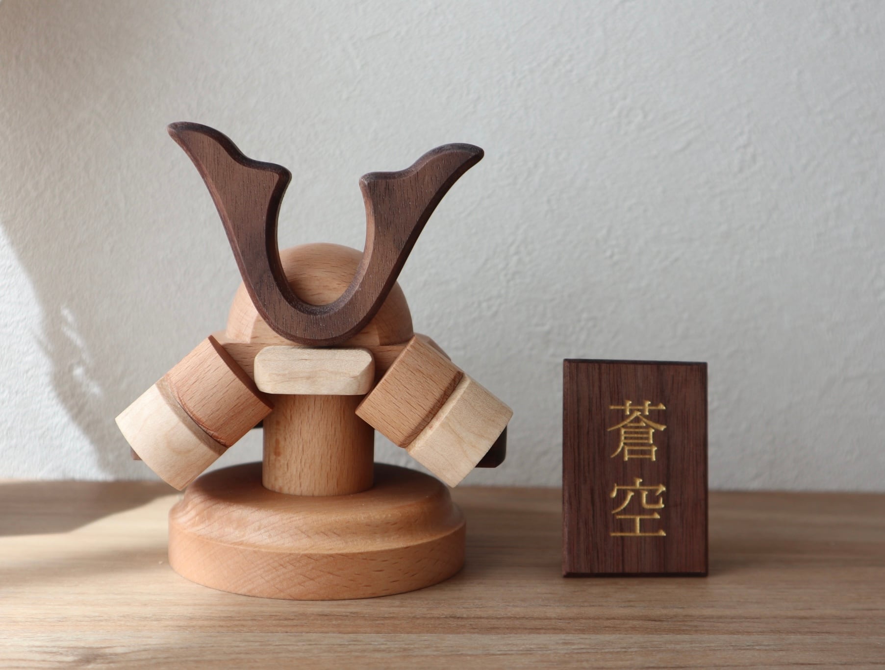 すべて木製で製作した温かみのある兜です。