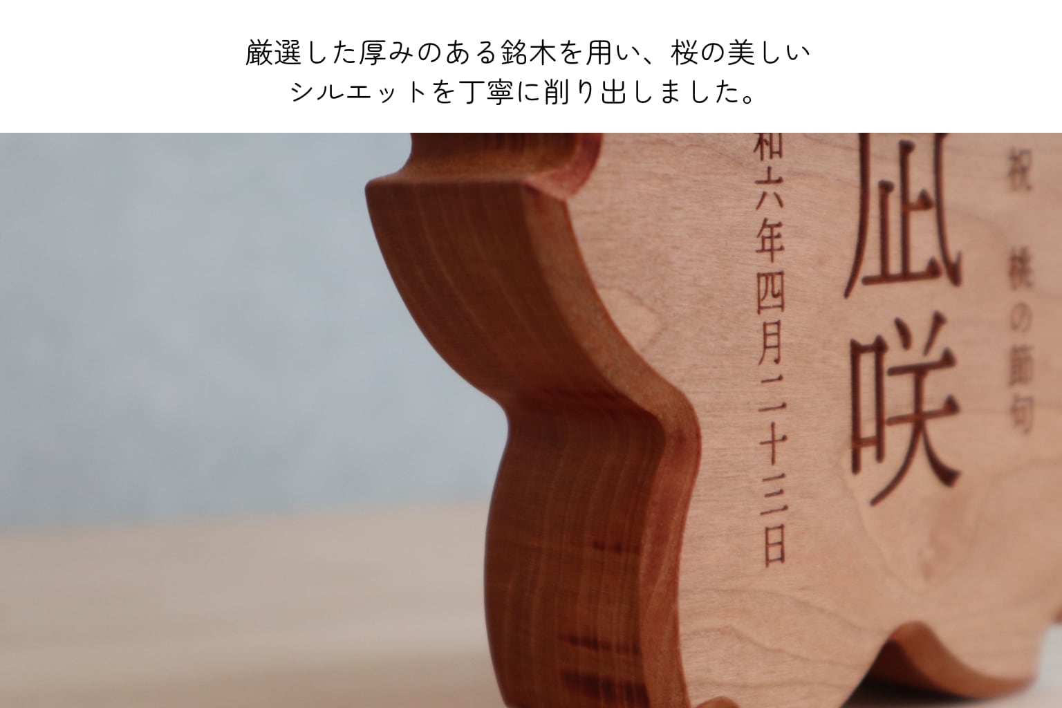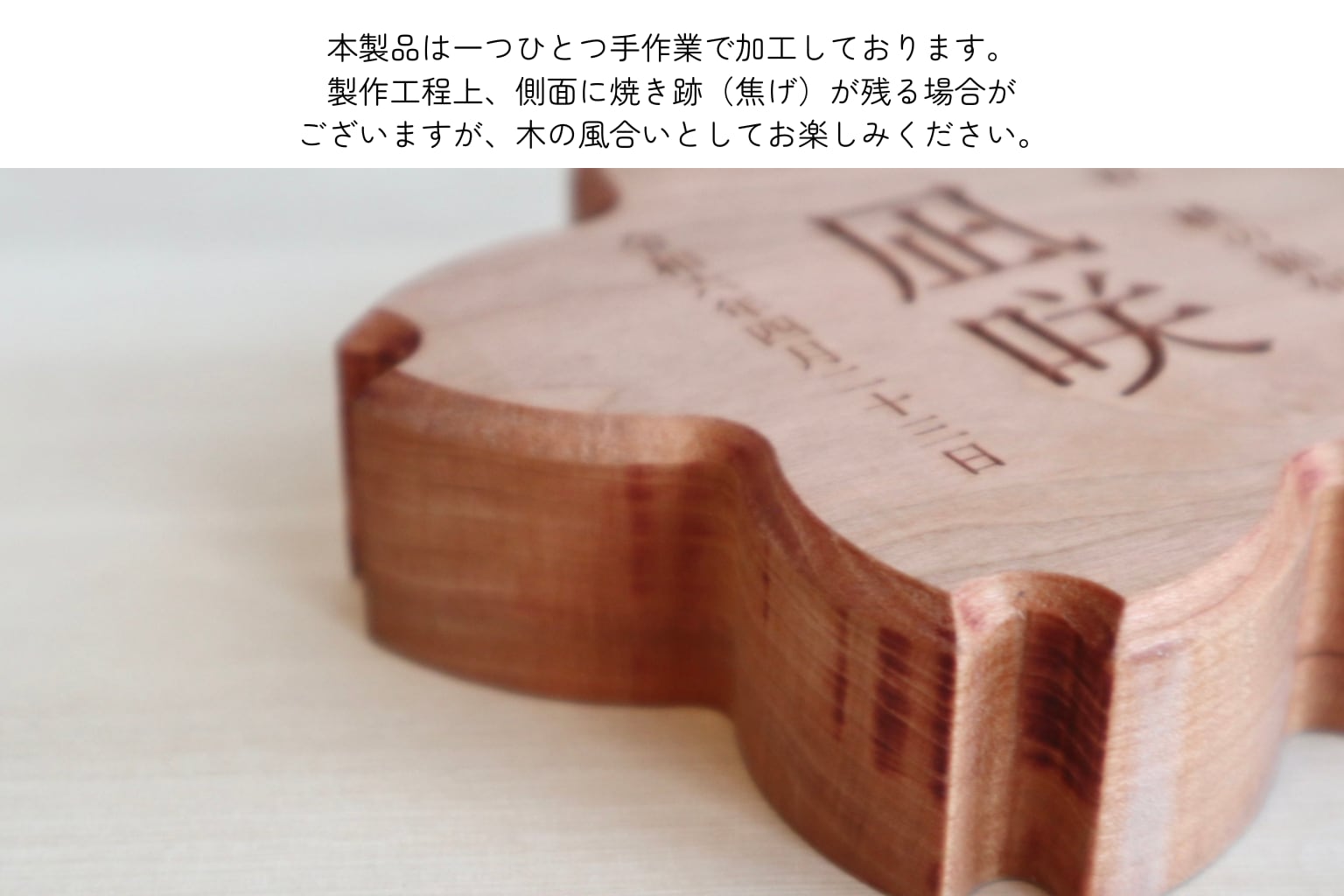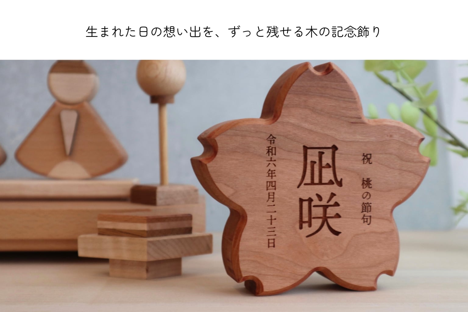 彫刻による文字表現が木の風合いと調和し、雛人形と並べても上品な存在感を放ちます。
