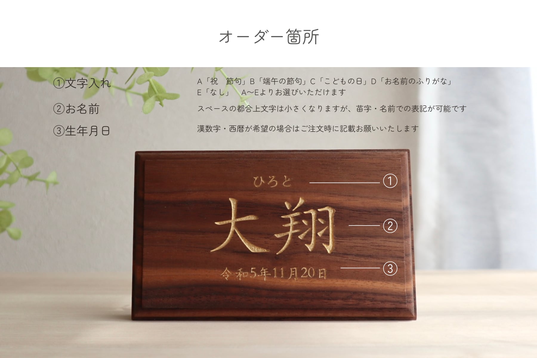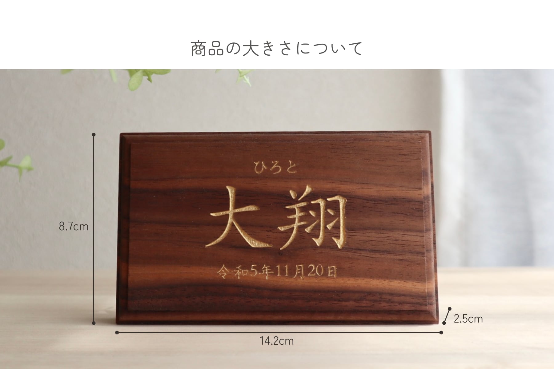 木のぬくもりとともに残せる名前木札です。